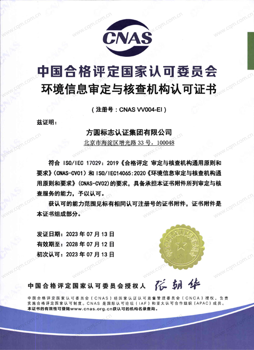 環(huán)境信息審定與核查機(jī)構(gòu)認(rèn)可證書