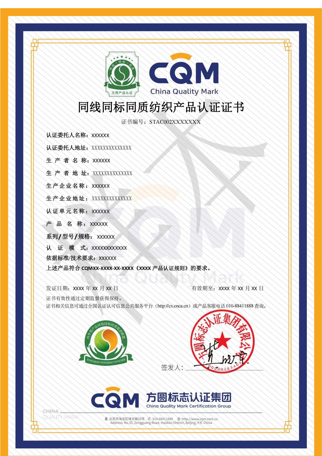 1.  同線同標(biāo)同質(zhì)紡織品產(chǎn)品認(rèn)證證書: