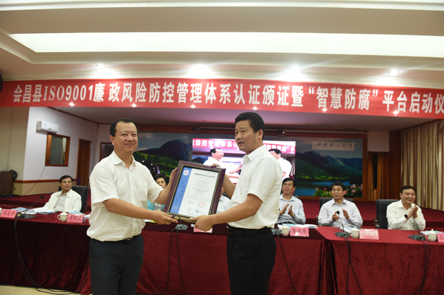 10月23日下午,江西省會昌縣舉行“基于質(zhì)量管理體系標(biāo)準(zhǔn)的廉政風(fēng)險防控管理體系”認(rèn)證頒證暨“智慧防腐”平臺啟動儀式。在國家質(zhì)檢總局局長支樹平,江西省委常委、贛州市委書記李炳軍,江西省副省長謝茹等領(lǐng)導(dǎo)的見證下,方圓集團(tuán)董事長高建忠向會昌縣委、縣政府頒發(fā)了全國首張廉政風(fēng)險防控管理體系認(rèn)證證書。