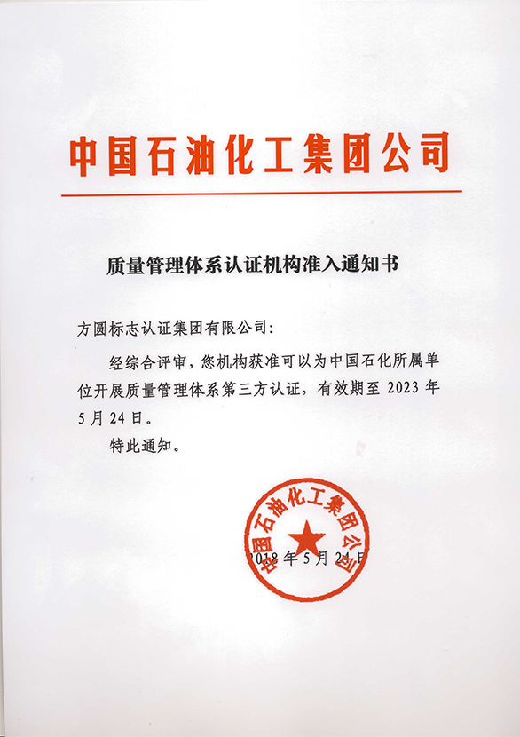 2018年6月8日,中國石油化工集團公司召開2018年質(zhì)量管理體系認證準入機構工作會議,方圓集團以綜合評價第三名的成績獲得第三輪準入認證機構資格,并頒發(fā)了“質(zhì)量管理體系認證機構準入通知書”。