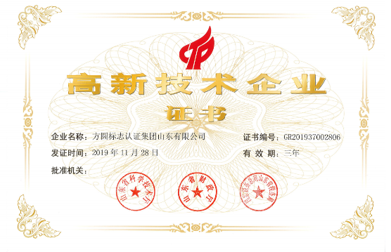 時(shí)間:2020年04月23日 方圓山東公司被認(rèn)定為2019年山東省第一批國(guó)家級(jí)高新技術(shù)企業(yè)。2020年4月17日,方圓山東公司取得了由山東省科技廳、山東省財(cái)政廳、國(guó)家稅務(wù)總局山東省稅務(wù)局聯(lián)合頒發(fā)的《高新技術(shù)企業(yè)證書》。